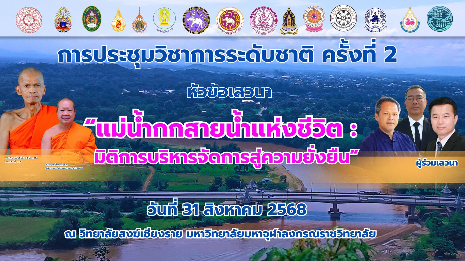 วิทยาลัยสงฆ์เชียงราย จัดประชุมวิชาการระดับชาติ ครั้งที่ ๒ “แม่น้ำกกสายน้ำแห่งชีวิต : มิติการบริหารจัดการสู่ความยั่งยืน” วันที่ ๓๑ สิงหาคม ๒๕๖๘ วิทยาลัยสงฆ์เชียงราย มหาวิทยาลัยมหาจุฬาลงกรณราชวิทยาลัย ร่วมกับภาคีเครือข่าย ๑๕ หน่วยงาน จัดประชุมวิชาการระดับชาติ ครั้งที่ ๒ ภายใต้หัวข้อ “แม่น้ำกกสายน้ำแห่งชีวิต : มิติการบริหารจัดการสู่ความยั่งยืน” ณ วิทยาลัยสงฆ์เชียงราย ทั้งในรูปแบบ Onsite และ Online เพื่อเปิดพื้นที่แลกเปลี่ยนองค์ความรู้จากหลากหลายศาสตร์ สู่การอนุรักษ์และพัฒนาแม่น้ำกกอย่างยั่งยืน ช่วงเช้า : ธรรมะ ผสานวิชาการ ภายในงาน ได้รับความเมตตาจาก พระพรหมวัชรธีราจารย์, ศ.ดร. อธิการบดีมหาวิทยาลัยมหาจุฬาลงกรณราชวิทยาลัย เป็นประธานเปิดงานและแสดงปาฐกถาพิเศษในหัวข้อ “พระพุทธศาสนากับการบริหารจัดการสู่ความยั่งยืน”พระราชวชิรคณี, ดร. ผู้อำนวยการวิทยาลัยสงฆ์เชียงราย กล่าวถวายรายงาน พร้อมขานรายนามภาคีเครือข่ายที่ได้รับเกียรติบัตรและของที่ระลึก จากนั้น นายประเสริฐ จิตต์พลีชีพ รองผู้ว่าราชการจังหวัดเชียงราย ให้เกียรติกล่าวต้อนรับแขกผู้มีเกียรติ ผู้บริหาร และนักวิชาการ พร้อมด้วย นางอทิตาธร…