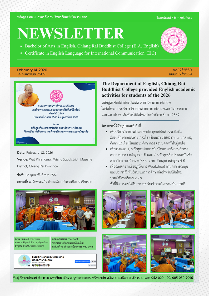 หลักสูตรศิลปศาสตรบัณฑิต สาขาวิชาภาษาอังกฤษได้จัดโครงการบริการวิชาการด้านภาษาอังกฤษและกิจกรรมการแนะแนวประชาสัมพันธ์นิสิตใหม่ประจำปีการศึกษา ๒๕๖๙ โครงการนี้มีวัตถุประสงค์ ดังนี้:เพื่อบริการวิชาการด้านภาษาอังกฤษแก่นักเรียนระดับชั้น มัธยมศึกษาตอนปลาย กลุ่มโรงเรียนพระปริยัติธรรม แผนกสามัญ ศึกษา และโรงเรียนมัธยมศึกษาตลอดจนบุคคลทั่วไปผู้สนใจเพื่อแนะแนว หลักสูตรประกาศนียบัตรภาษาอังกฤษสื่อสารสากล (ป.อส.) หลักสูตร ๑ ปี และหลักสูตรศิลปศาสตรบัณฑิตสาขาวิชาภาษาอังกฤษ (ศศ.บ. ภาษาอังกฤษ) หลักสูตร ๔ ปีเพื่อจัดกิจกรรมเชิงปฏิบัติการ (Workshop) ด้านภาษาอังกฤษและประชาสัมพันธ์แนะแนวการศึกษาต่อสำหรับนิสิตใหม่ประจำปีการศึกษา ๒๕๖๙ทั้งนี้กิจกรรมฯ ได้รับการตอบรับเข้าร่วมกิจกรรมเป็นอย่างดี